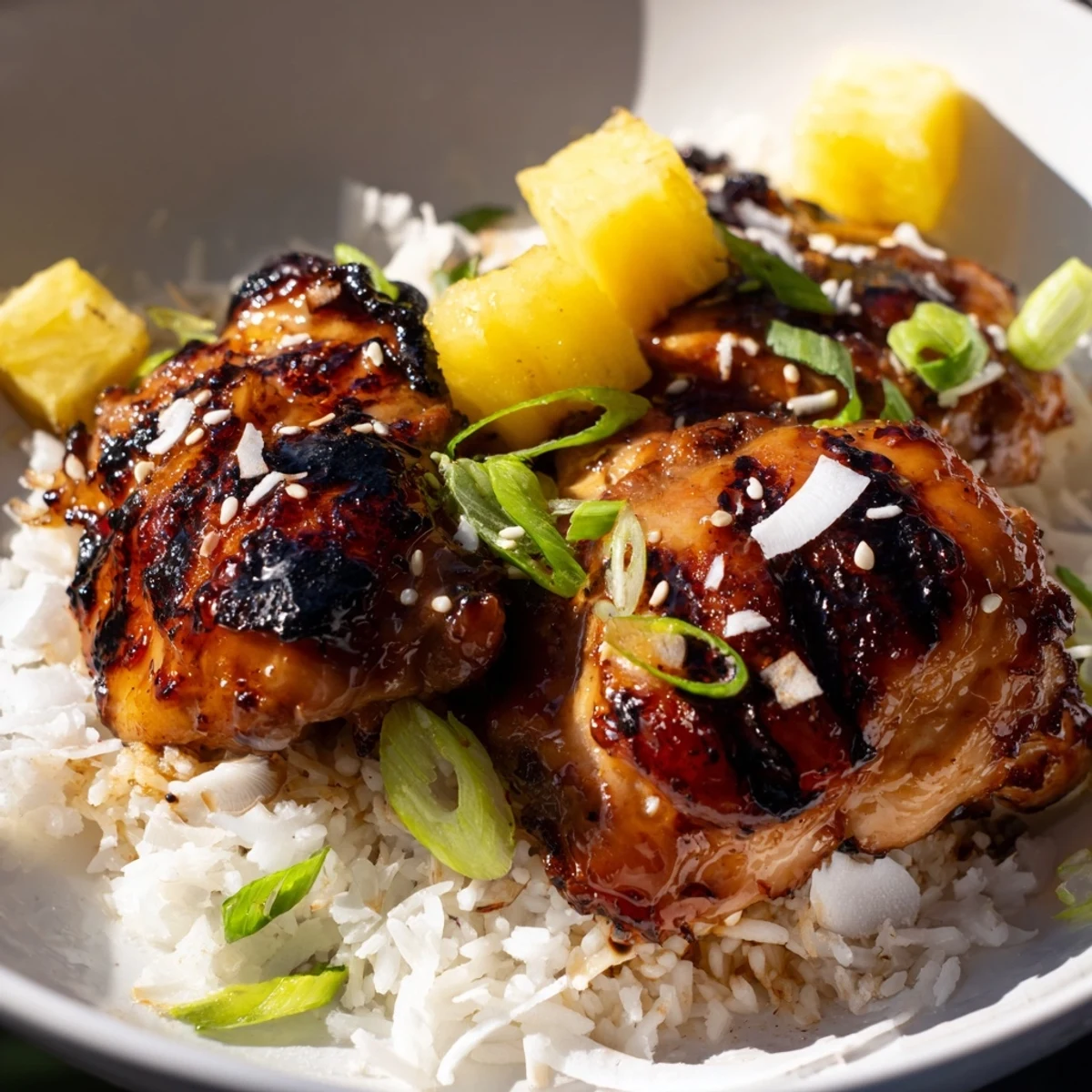 Bring island flavors to your kitchen with this Hawaiian-inspired bowl. Chicken thighs soak in a sweet and savory marinade of soy sauce, honey, pineapple juice, garlic, and ginger, then get perfectly grilled or seared until caramelized. Meanwhile, jasmine rice simmers in rich coconut milk for a creamy, aromatic base. Top it all with fresh pineapple cubes, crunchy toasted coconut, sesame seeds, and bright green onions. The entire dish comes together in just 50 minutes, making it perfect for weeknight dinners or casual entertaining.