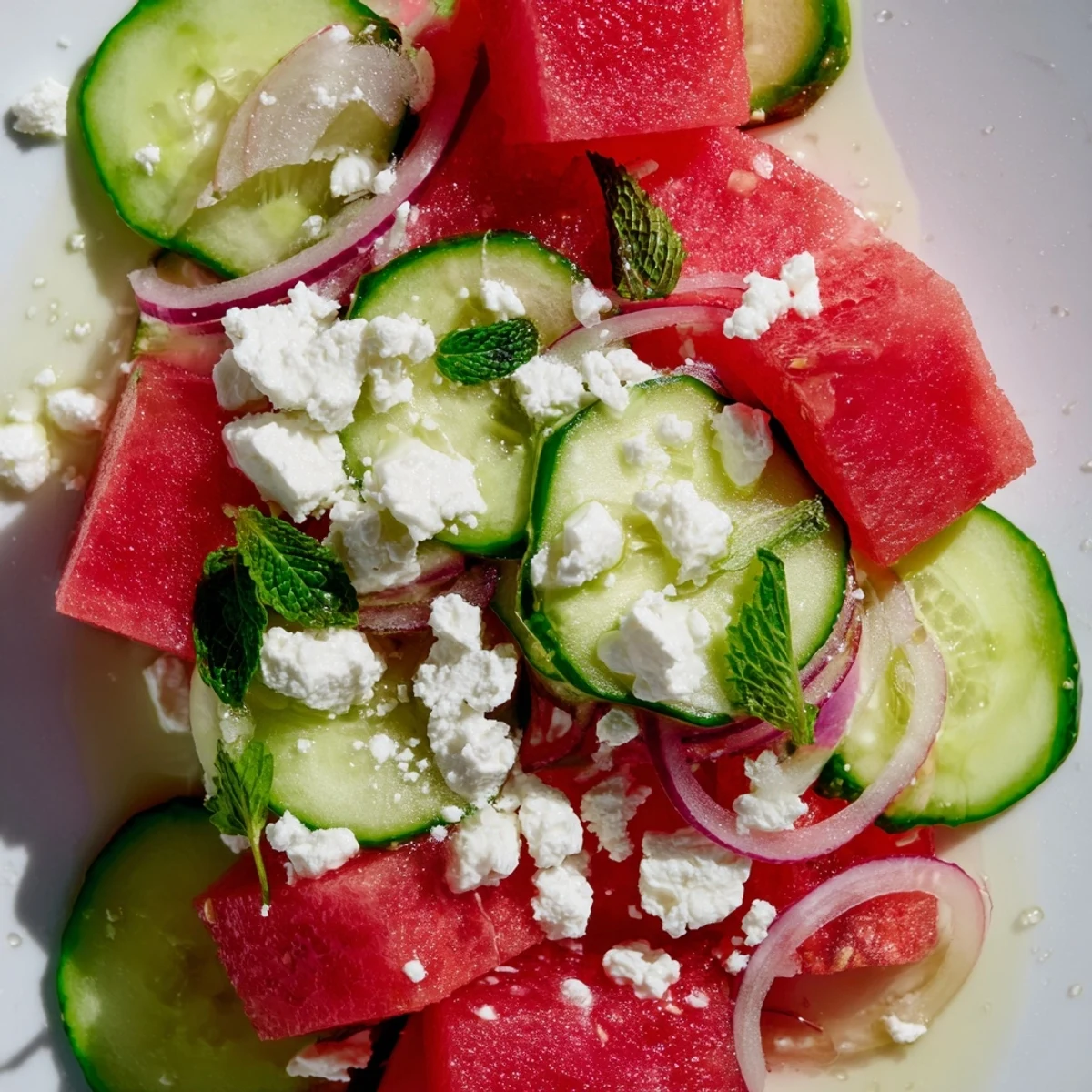 - Drizzle the dressing over the salad and toss gently with your hands or two spoons to coat everything without breaking up the watermelon.